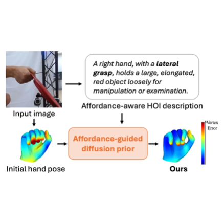 We propose a generative prior for hand pose refinement guided by affordance-aware textual descriptions of hand-object interactions. Our method employs a diffusion-based generative model that learns the distribution of plausible hand poses conditioned on affordance descriptions, which are inferred from VLMs.